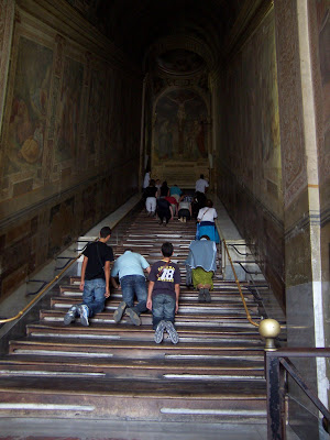 Pero quizás, lo más interesante de esta basílica es lo que hay en su anexo, el Sancta Santorum de San Juan de Letrán: la Scala Sancta. Esta escalera de mármol de 28 escalones es, según la tradición católica, la que ascendía hacia el pretorio de Pilato en Jerusalén y que fue subida por Jesucristo durante su Pasión. Los historiadores del monumento afirman que la Scala Sancta fue traída de Jerusalén a Roma hacia el año 326 por Santa Helena, Madre de Constantino el Grande y ubicada en San Juan de Letrán hasta que en 1589, el Papa Sixto V, la trasladó a su actual ubicación. Los escalones de mármol solo pueden ser ascendidos de rodillas, tradición que sigue muy arraigada por los peregrinos: