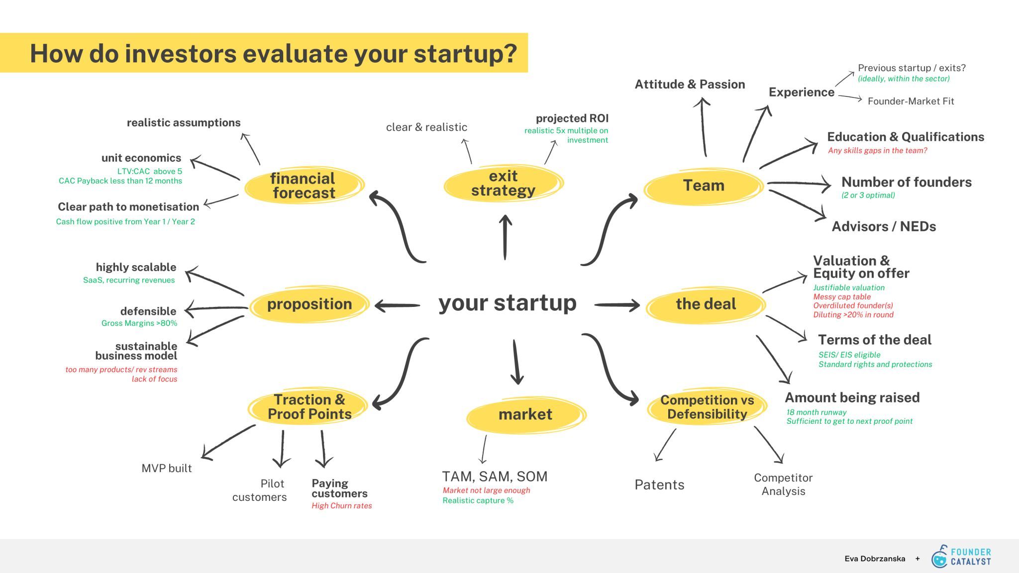 Según el esquema que plantea Eva Dobrzańska, hay 8 pilares fundamentales sobre los que se fundamenta el análisis de viabilidad de una startup en fase temprana desde la perspectiva de un inversor.
