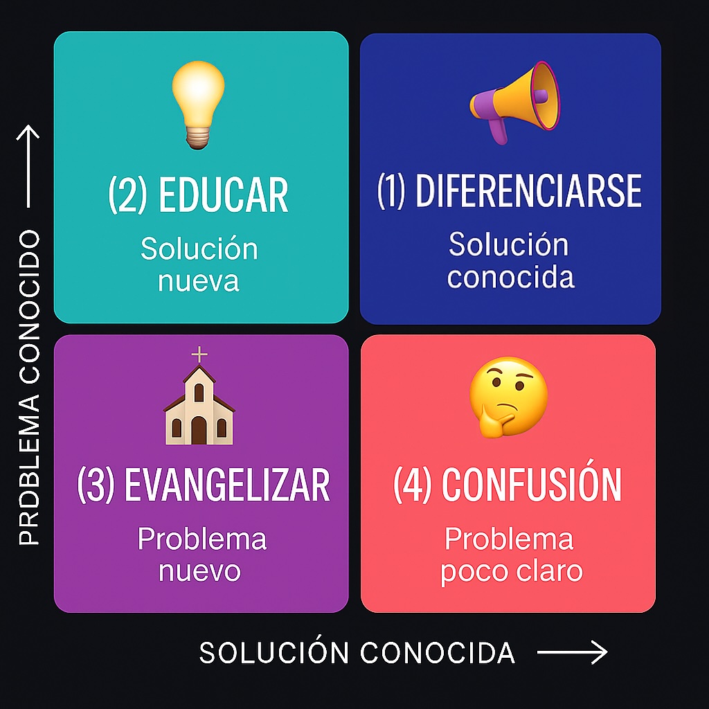 | (3) Solución nueva + Problema nuevo | Evangelizar | Ni el problema ni la solución son evidentes. Estás en terreno pionero o con baja conciencia del dolor. | Crear categoría y conciencia | Narrativas aspiracionales, storytelling, framing del problema, contenido educativo, comparaciones o metáforas, comunicar visión antes que funcionalidad. |